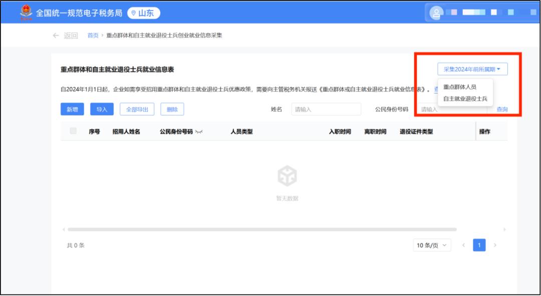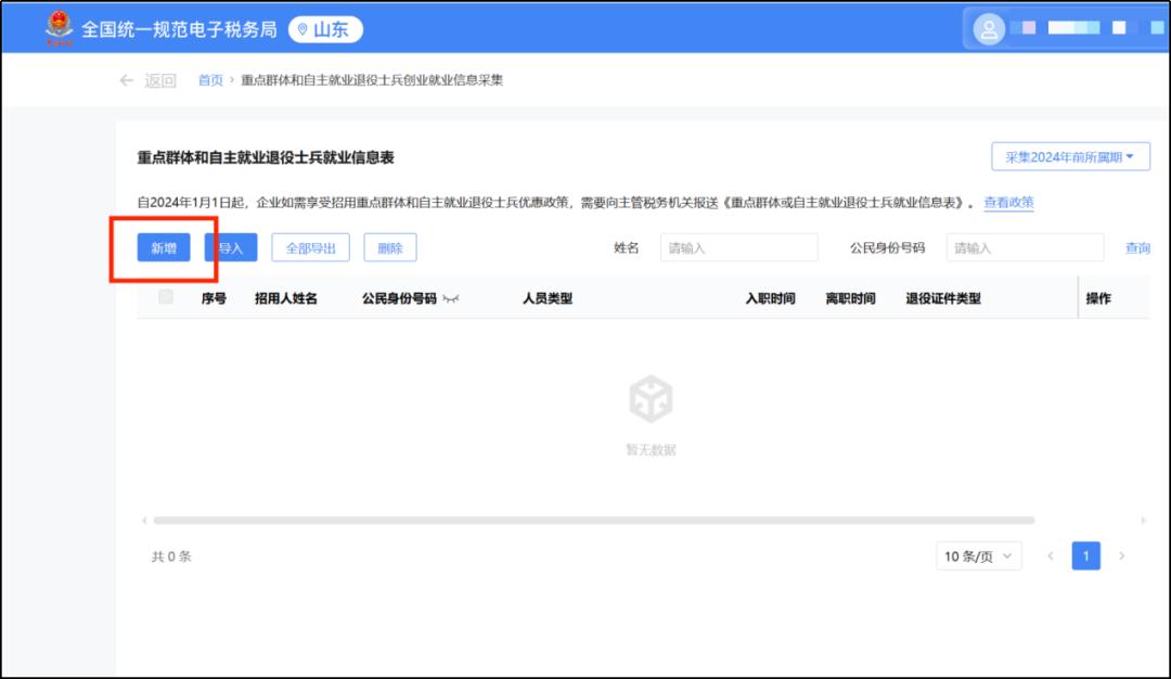 2.跳转至“重点群体和自主就业退役士兵创业就业信息采集”页面,自2024年1月1日起,企业如需享受招用重点群体和自主就业退役士兵优惠政策,需要填写《重点群体和自主就业退役士兵信息表》,点击【新增】选项。