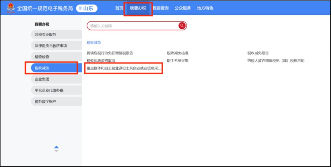 1.登录电子税务局网页版,依次点击【我要办税】→【税收减免】→【重点群体和自主就业退役士兵创业就业信息采集】选项。