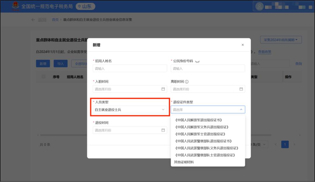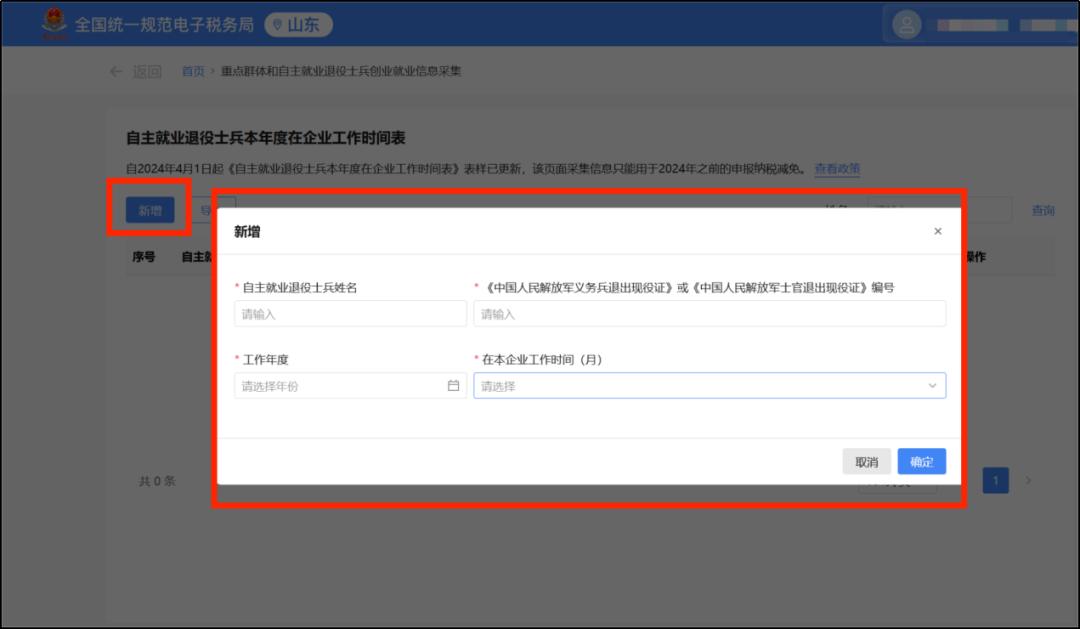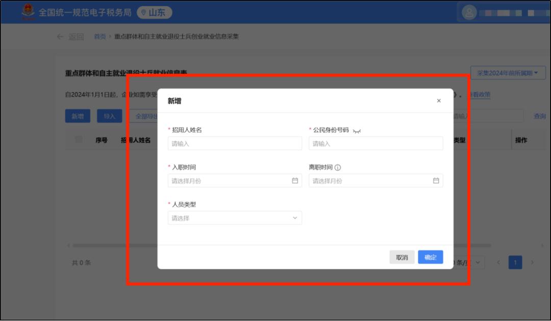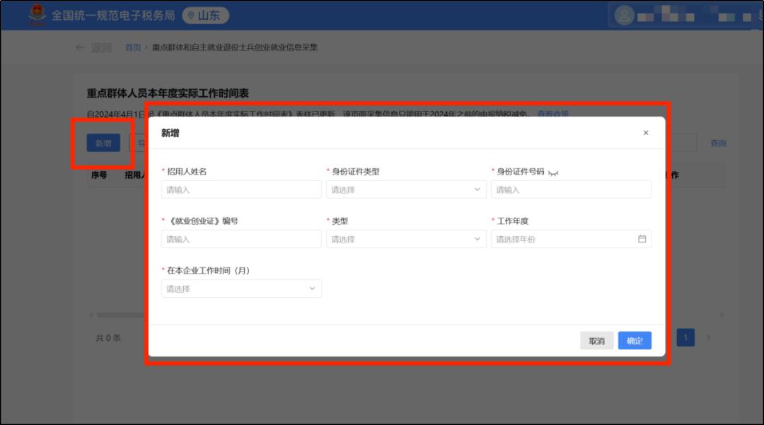 5.点击【新增】后,按人员身份填写完善相应工作时间表中的招用人员信息,即可完成2024年前所属期信息采集。